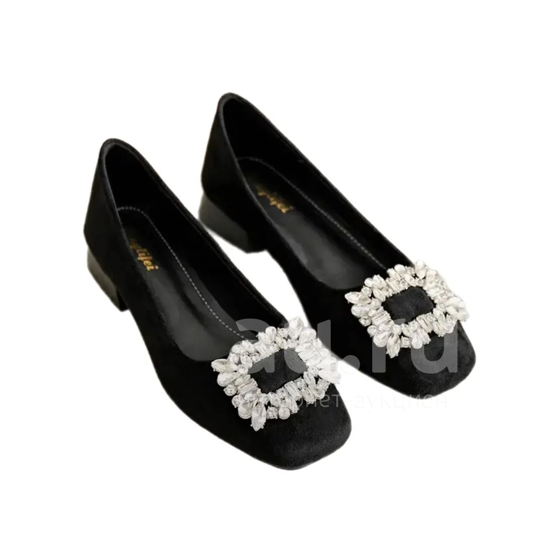 Продам новые замшевые туфли, размер 39. Изготовлены из натуральной черной замши с пряжками со стразами. Мягкие. Широкий, низкий каблук. Высота каблука — 3 см, длина стельки — 26 см. На подошве выбит 41 размер. Подходят для особых случаев.