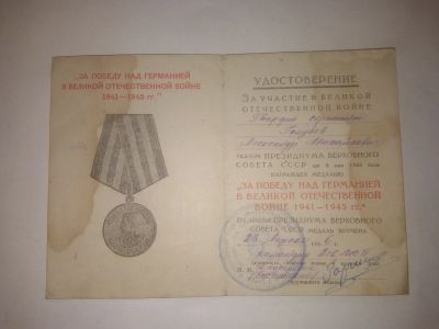 Удостоверение к медали за победу над Германией на Гвардии сержанта 1946 г.Копия