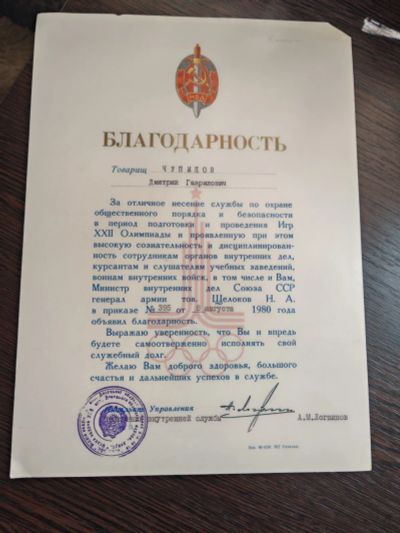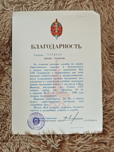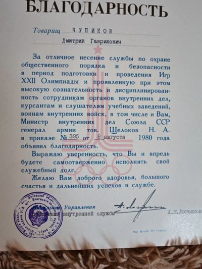 БЛАГоДАРноСТЬ за отличную службу от МИНиСТРА МВД Щёлокова Н.А.1980 год